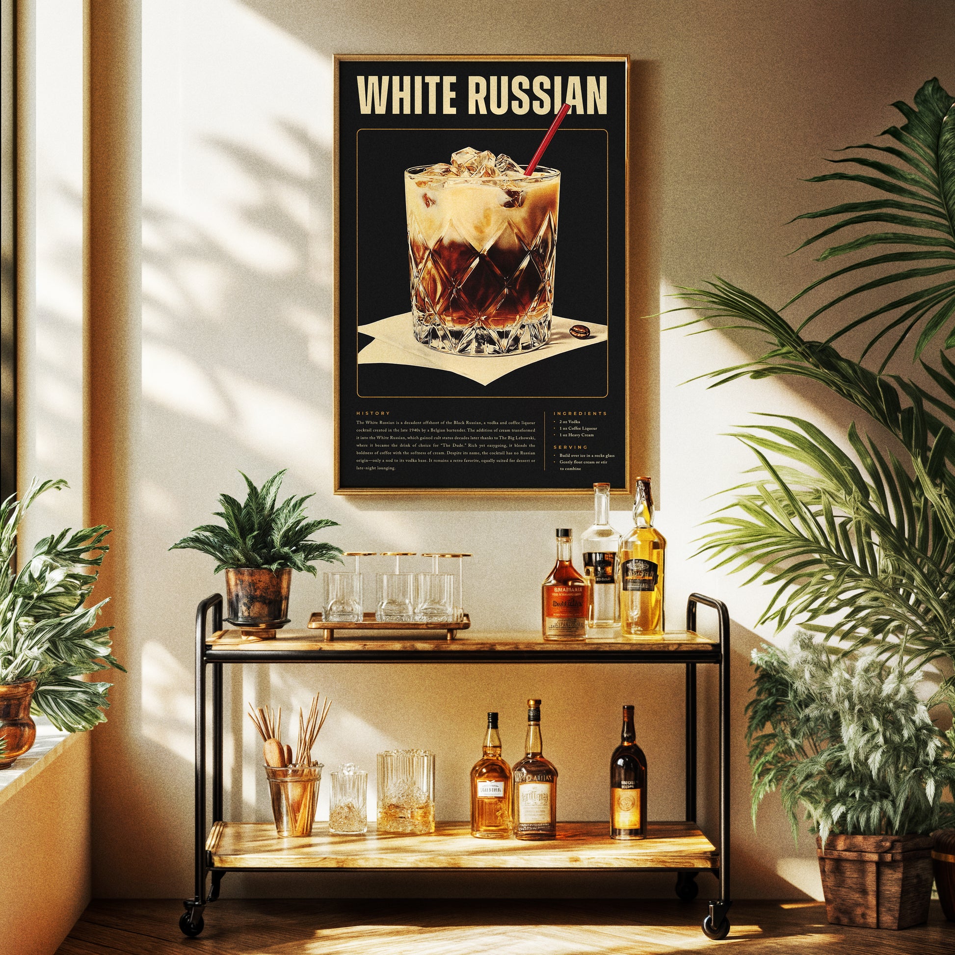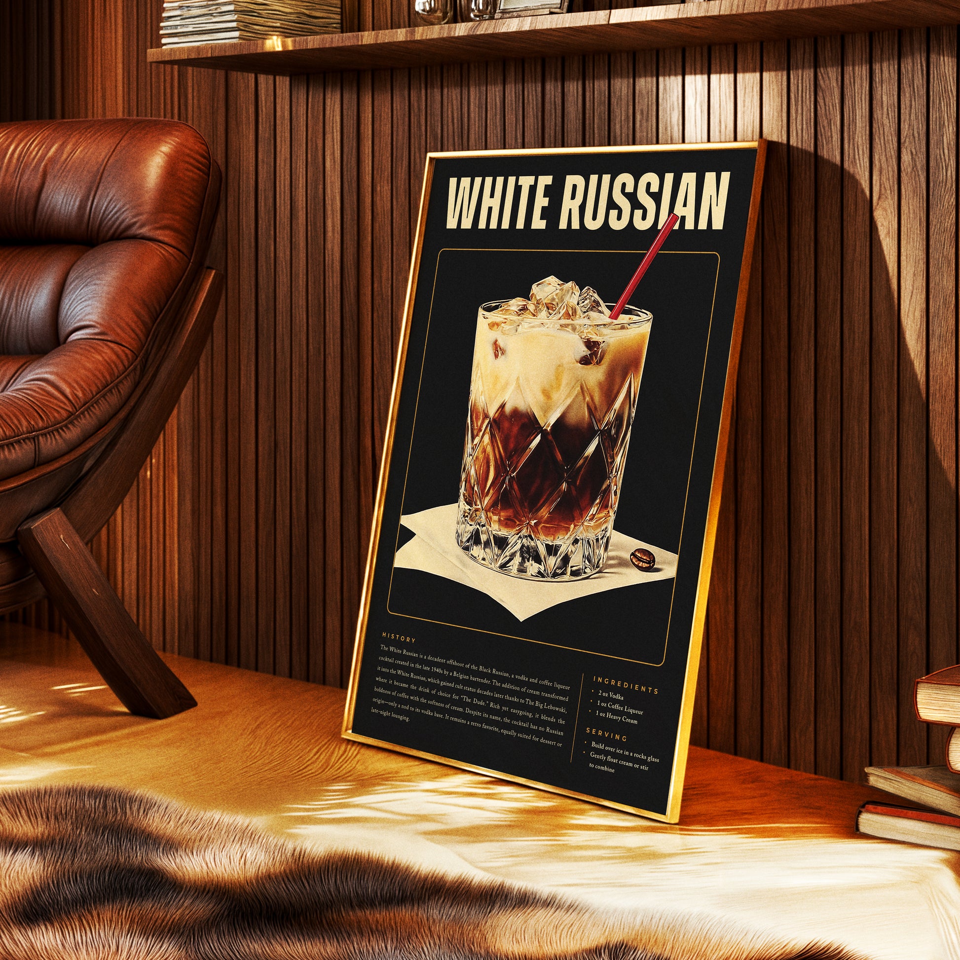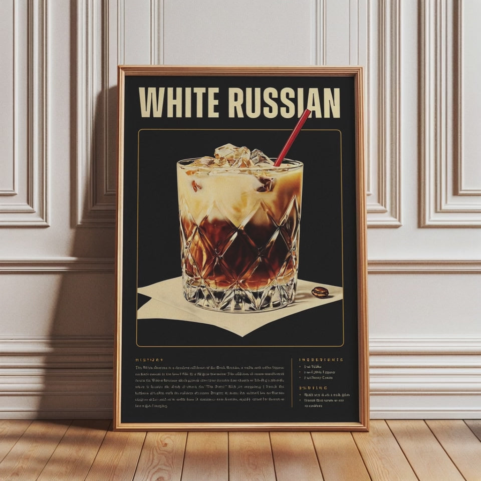 Creamy, cool, and unapologetically indulgent — the White Russian gets a retro-styled tribute in this richly illustrated art print. From its layered coffee tones to the nod to The Big Lebowski, this piece captures the decadent charm of a cult favorite. Complete with its cocktail origins, recipe, and signature rocks glass, it’s perfect for dessert drinkers, late-night loungers, or fans of “The Dude.”