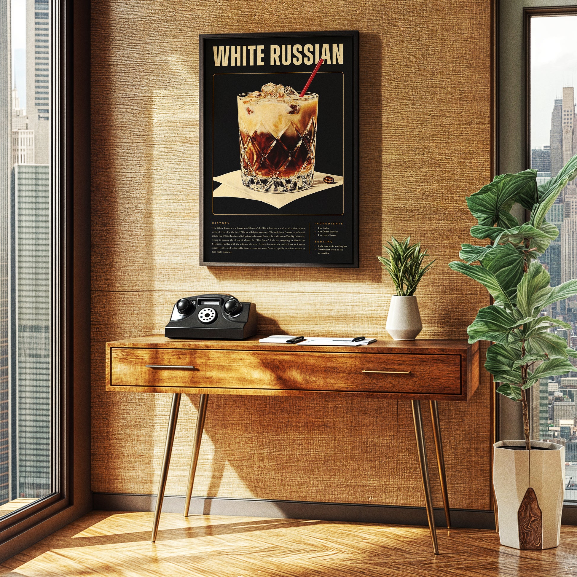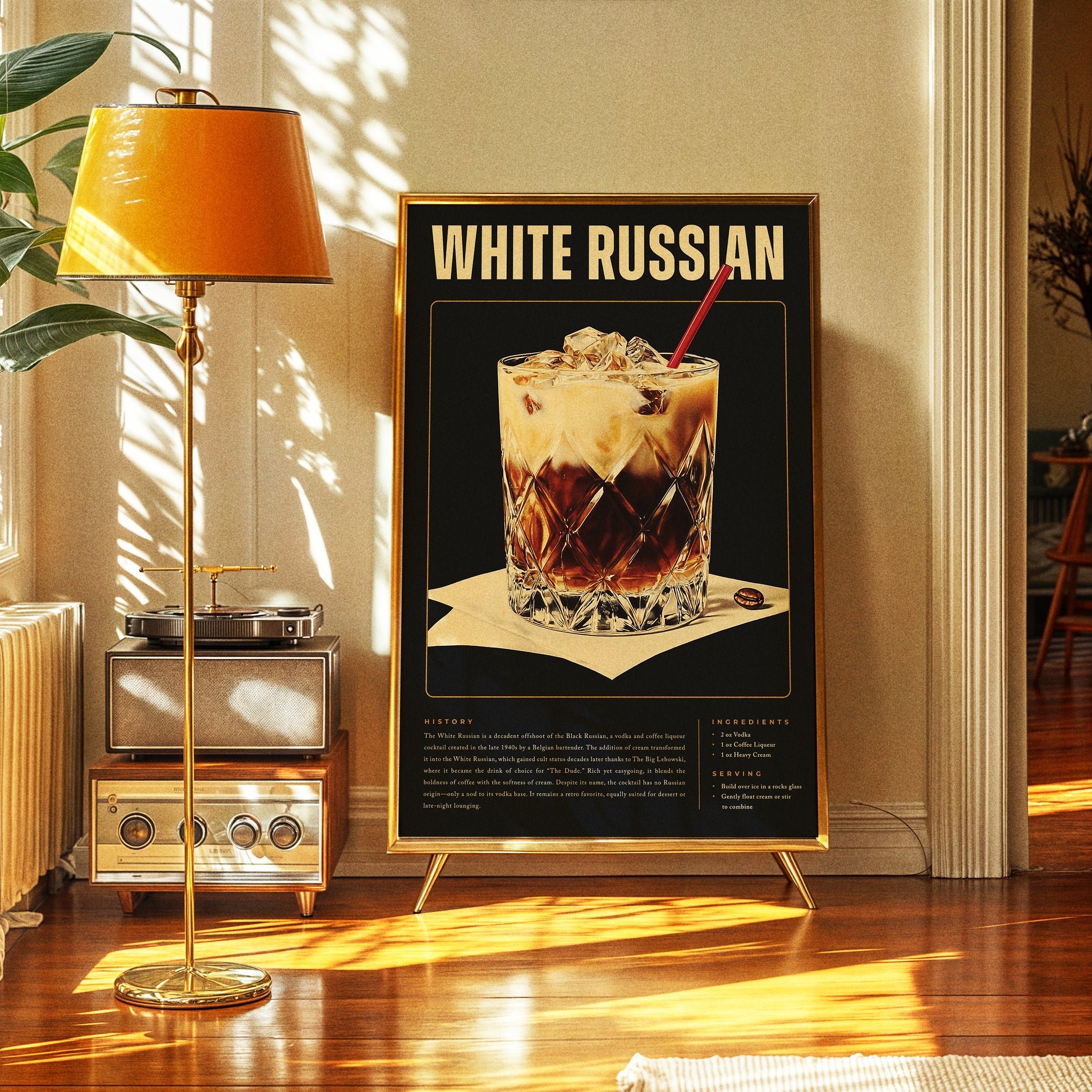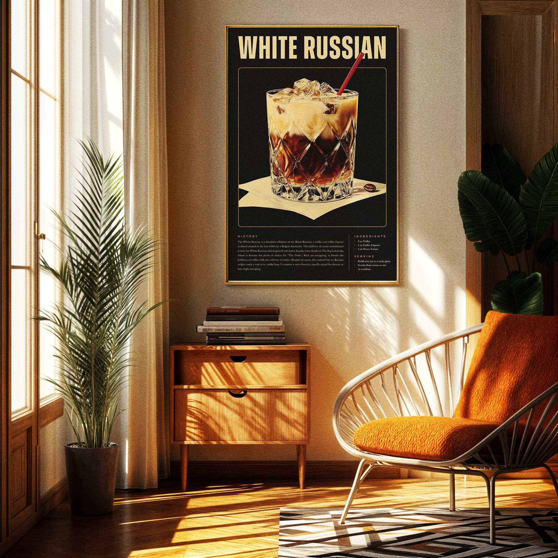Creamy, cool, and unapologetically indulgent — the White Russian gets a retro-styled tribute in this richly illustrated art print. From its layered coffee tones to the nod to The Big Lebowski, this piece captures the decadent charm of a cult favorite. Complete with its cocktail origins, recipe, and signature rocks glass, it’s perfect for dessert drinkers, late-night loungers, or fans of “The Dude.”